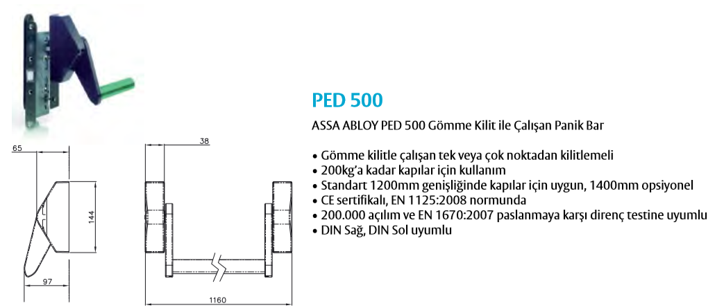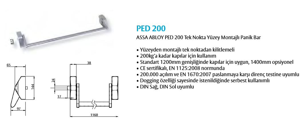 ASSA ABLOY’un panik çıkış aksesuarları, çıkış kapılarını mümkün olan tüm yangın ve güvenlik standartlarına ve yönetmeliklerine göre emniyet altına alır. ASSA ABLOY panik çıkış aksesuarları, tüm ihtiyaçları, konforu ve dizayn bütünlüğünü karşılamak için panik ve push bar olarak farklı modellerde tasarlanmıştır.